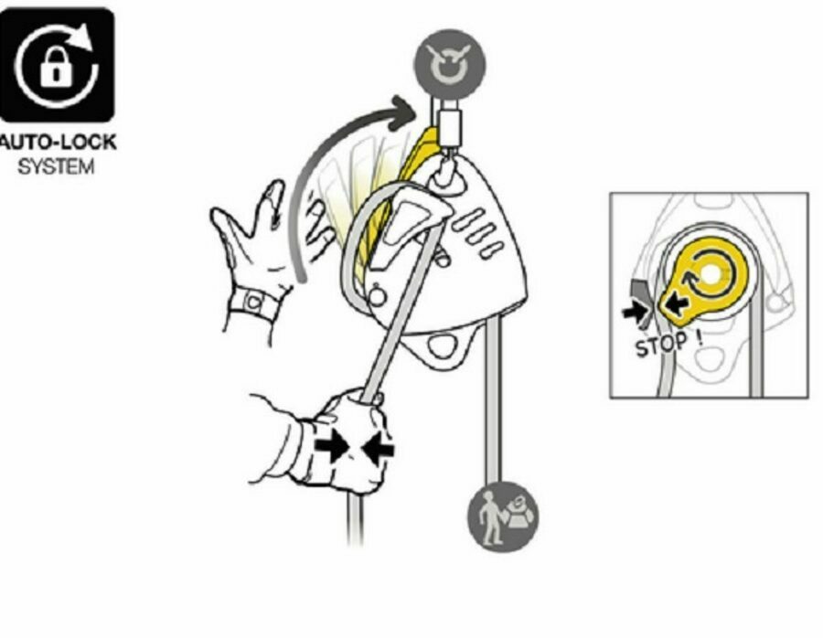 Easy to use: - easy rope installation, thanks to the markings on the device - ergonomic handle allows the rope to be released progressively and enables comfortable control of the descent - immediate shift from lowering position to hauling position without having to transfer the load - AUTO-LOCK system allows the rope to be blocked automatically when the handle is not in use. Once locked, the rope can be taken up without having to manipulate the handle.