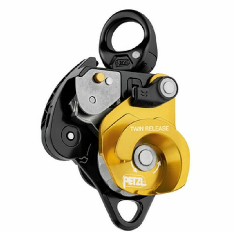Description: Releasable, the TWIN RELEASE progress capture pulley is designed to set up 4:1 haul systems for work in confined spaces or for technical rescue. Releasing the cam is possible with the ergonomic handle. The brake integrated into the moving side plate and the main faceted sheave with single-direction rotation, offer additional braking and better control when lowering heavy loads. The two sheaves provide excellent hauling efficiency. The swivel facilitates operations, allowing the pulley to be oriented under load and direct connection of carabiners, ropes, or slings.