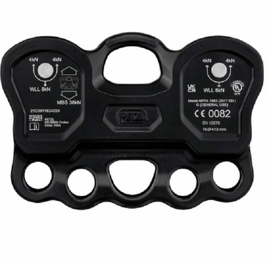Multiple configurations and connections are possible: - System can be made redundant by placing two REEVE pulleys side by side (if distance between ropes permits), or by connecting a pulley to the upper connection hole for ropes at a further distance - Pulley can be used in a haul system - Hole design allows ropes or slings to be threaded for direct connection - 19 mm holes allow locking sleeves of most carabiners to pass through - The odd number of attachment holes enables the system to be centered and balanced - Up to three people can be connected at the same time