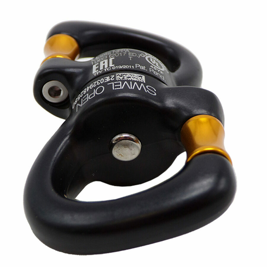 Description: The SWIVEL OPEN gated swivel features a wide opening and thus can be attached to a range of products (pulleys, lanyards...). It reduces the bulk and weight of component systems and solves the twisting and tangling problems of ropes and lanyards. Sealed ball bearings offer excellent performance and reliability.