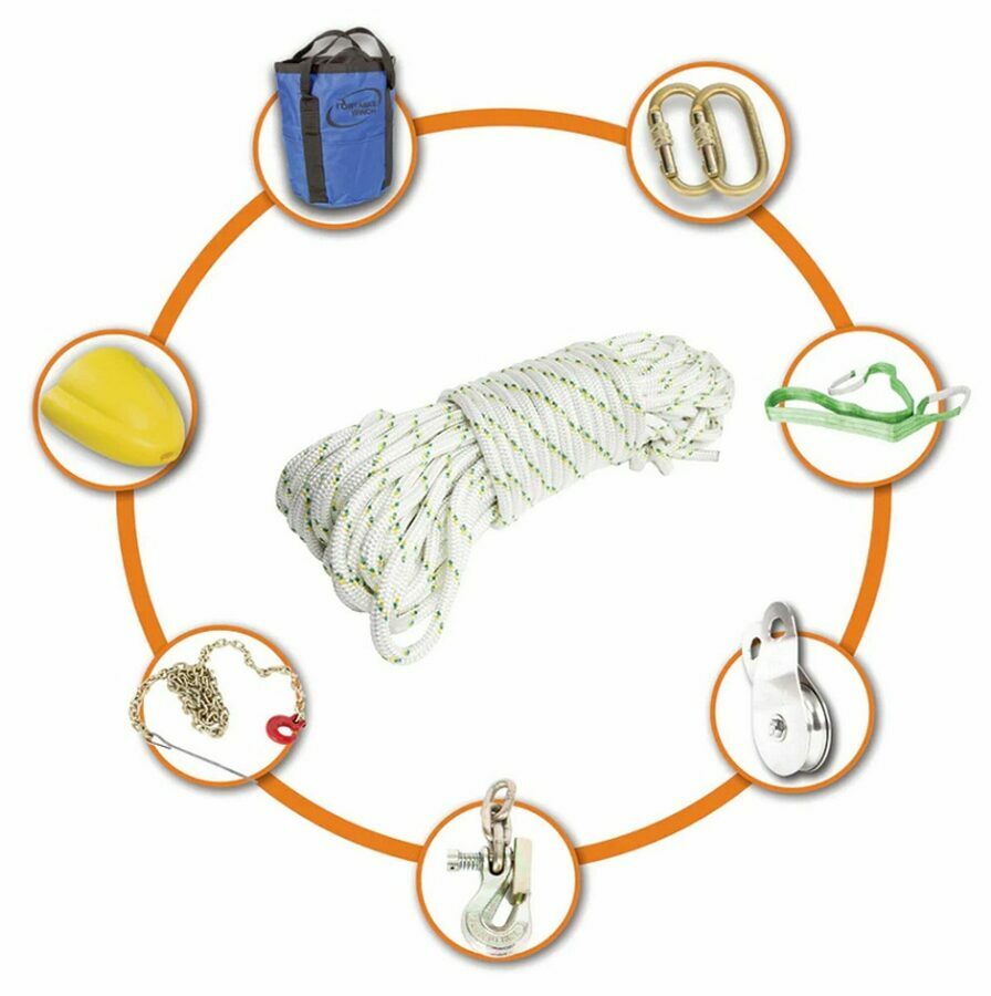 Description: This kit includes a 3/8'' x 164' rope, a bag to store it and a sturdy skidding cone, two carabiners, a choker chain, a grab hook, a polyester sling and a snatch block pulley that will either deflect a load or double the winching capacity.