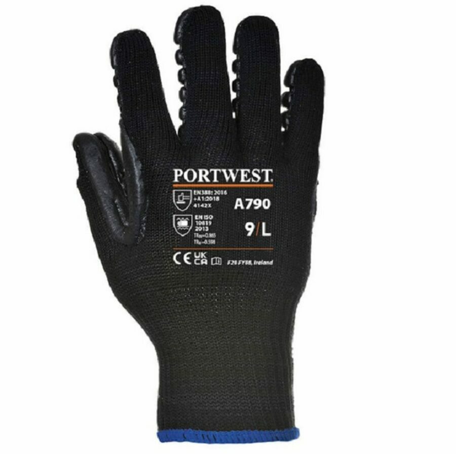 Description: Specially designed to reduce the effects of vibration For use with jack hammers, concrete breakers, etc. Specially formulated rubber chloroprene Anti-vibration pods on palm only. 100% breathable seamless liner