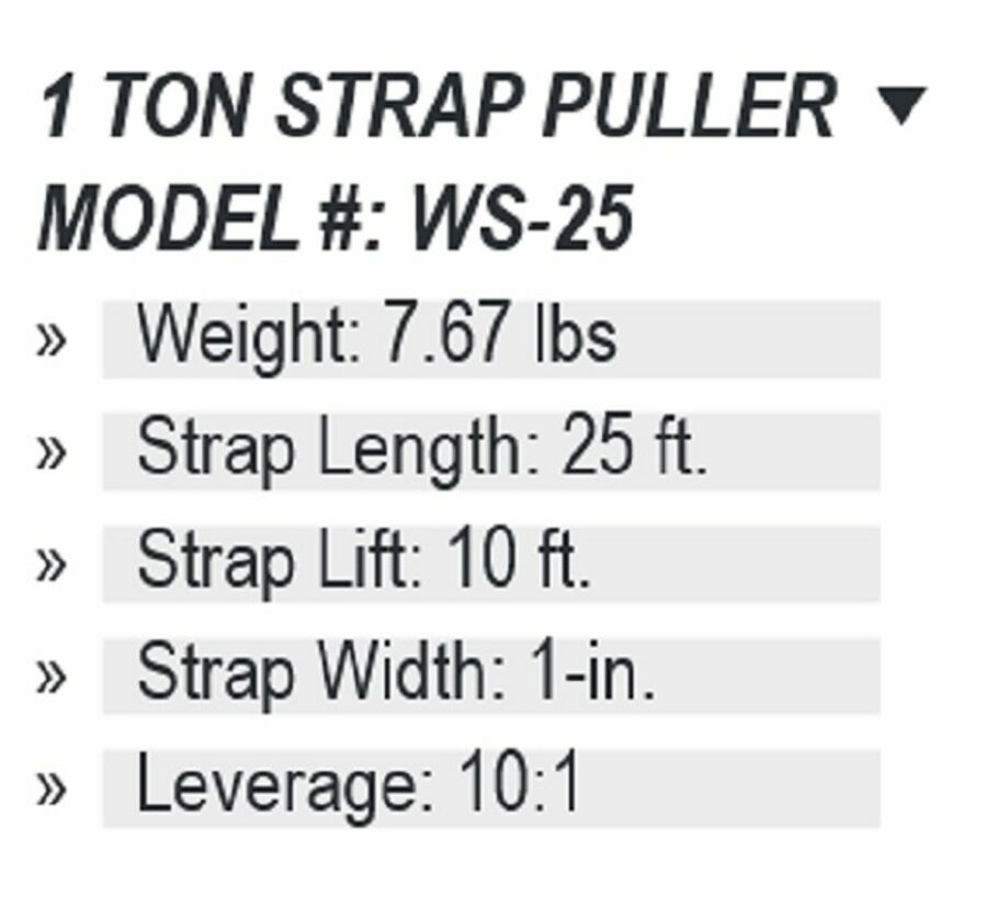 Description: 1 TON STRAP PULLER WITH 25 FOOT STRAP