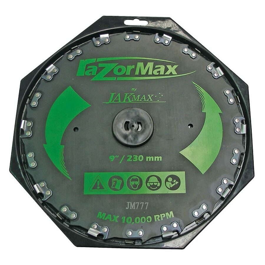 Description: 9" Razor Max Brushcutter Blade, 3/8" Pitch. Designed for fast & easy cutting of small trees, heavy brush, thick weeds & grass. Suitable for petrol powered trimmers & brushcutters with engines 300cc & above. Also designed to be used on circular saws to cut through wood, linoleum, fibreglass, Plexiglass etc. Designed to operate at a maximum 10,000 rpm. Chain kits available. Includes reducer washer.