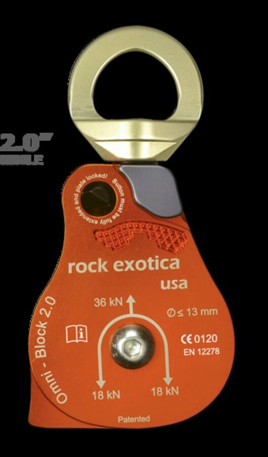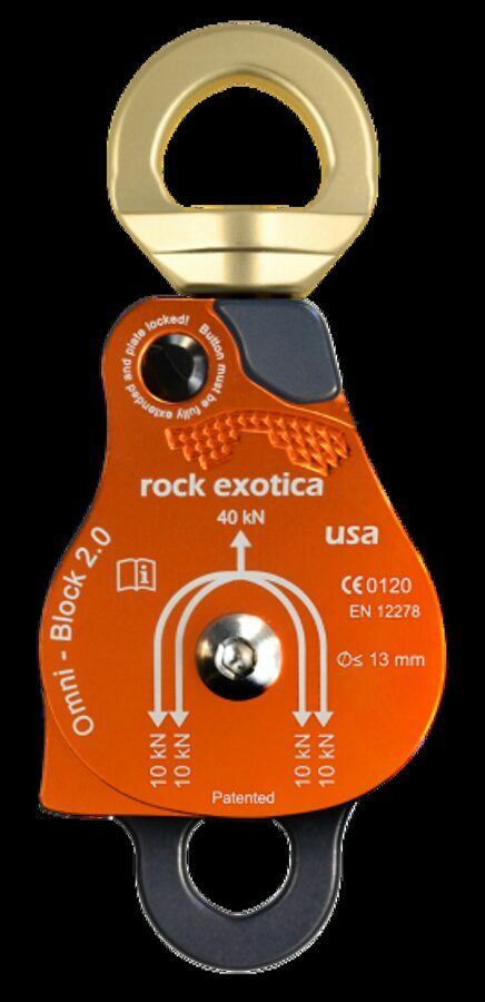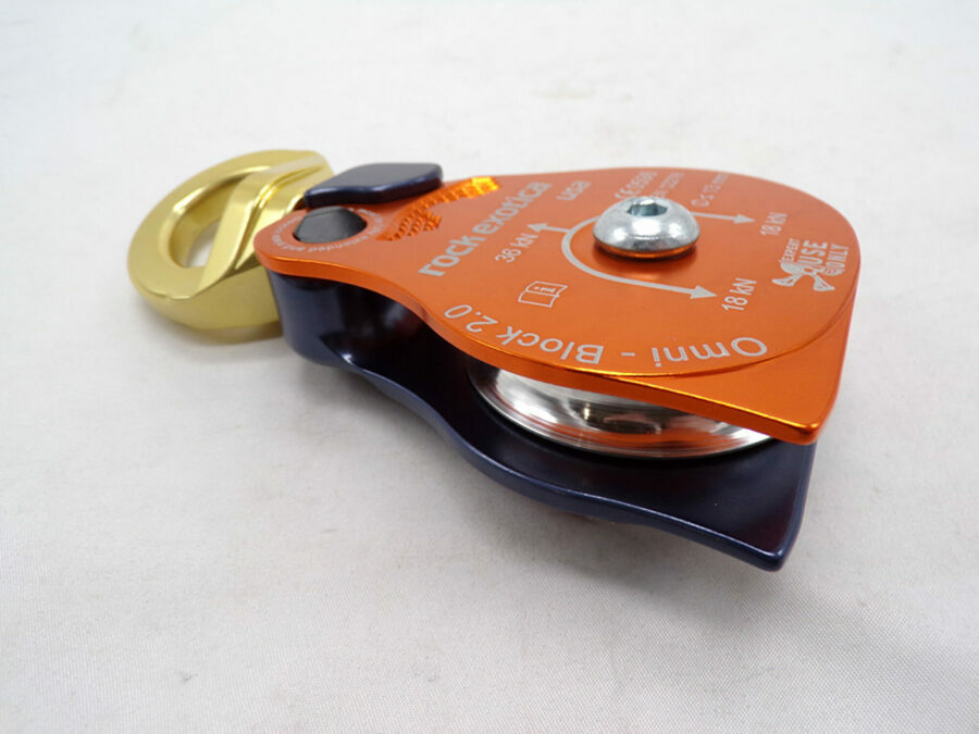 Description: Rock Exotica's Omni-Block combines a swivel and pulley into one tool, and incorporates a unique sideplate that opens while the pulley is still attached to the anchor. Traditionally, a pulley is connected to a swivel by a carabiner. However, the Omni eliminates the need for the carabiner, reducing length and pieces of equipment in the rigging system. The short length of the Omni is important when used in high-angle, confined space or other space-sensitive rigging environments. The reduced weight of the Omni will make hauling your gear easier. Additionally the Omni sideplate can be opened without detaching from the carabiner. Traditional pulleys require removing from the carabiner to change the rope. With the Omni, the user is able to do this while the pulley is still secured.