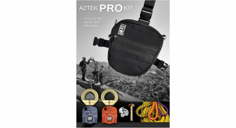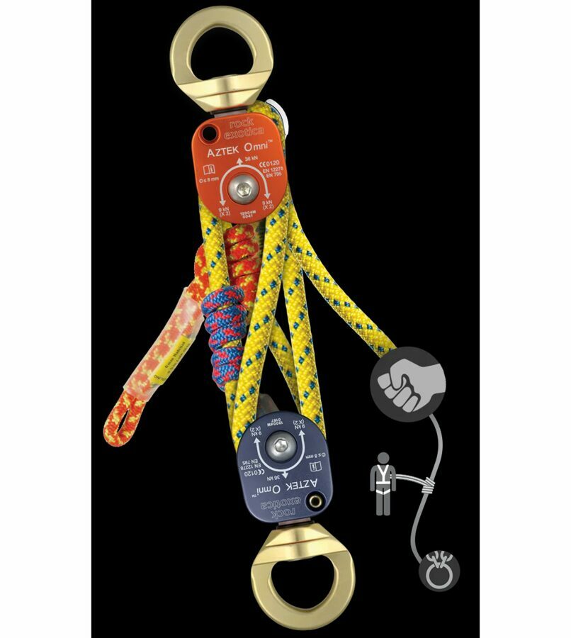 Description: The AZTEK system has become the ultimate Personal Mechanical Advantage kit that can be configured as a 5:1, or 4:1 with a re-direct by just rotating the system. The AZTEK can be used as a pick off, adjustable directional, high directional guyline, high angle attendant tether, high angle litter scoop, load release hitch and much more. Each pulley is color coded to match with a corresponding prusik for quick identification. The AZTEK pulleys are machined from solid aluminum, feature swivel connection points, and utilize high efficiency bearings.