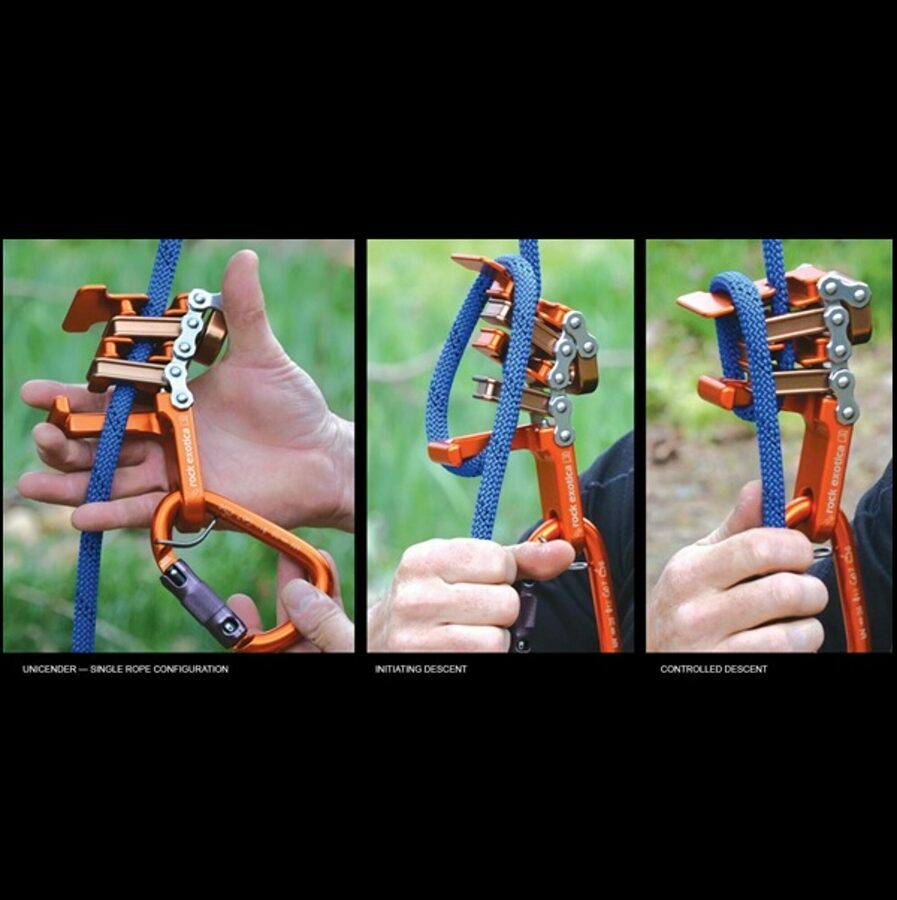 Description: Since its inception in 2005, the Unicender has been the most flexible tool for tree climbing. With the ability to be used in both Doubled Rope Technique DdRT and Single Rope Technique SRT, the Unicender fits the way you like to climb like no other tool. The Unicender utilizes unique friction plates that allow it to advance easily with minimal friction, and virtually no Sit Back, giving you the most efficiency per stride. Descending is just as easy by looping the rope around the plates in SRT as shown below. Additionally, the Unicender attaches conveniently mid-line.