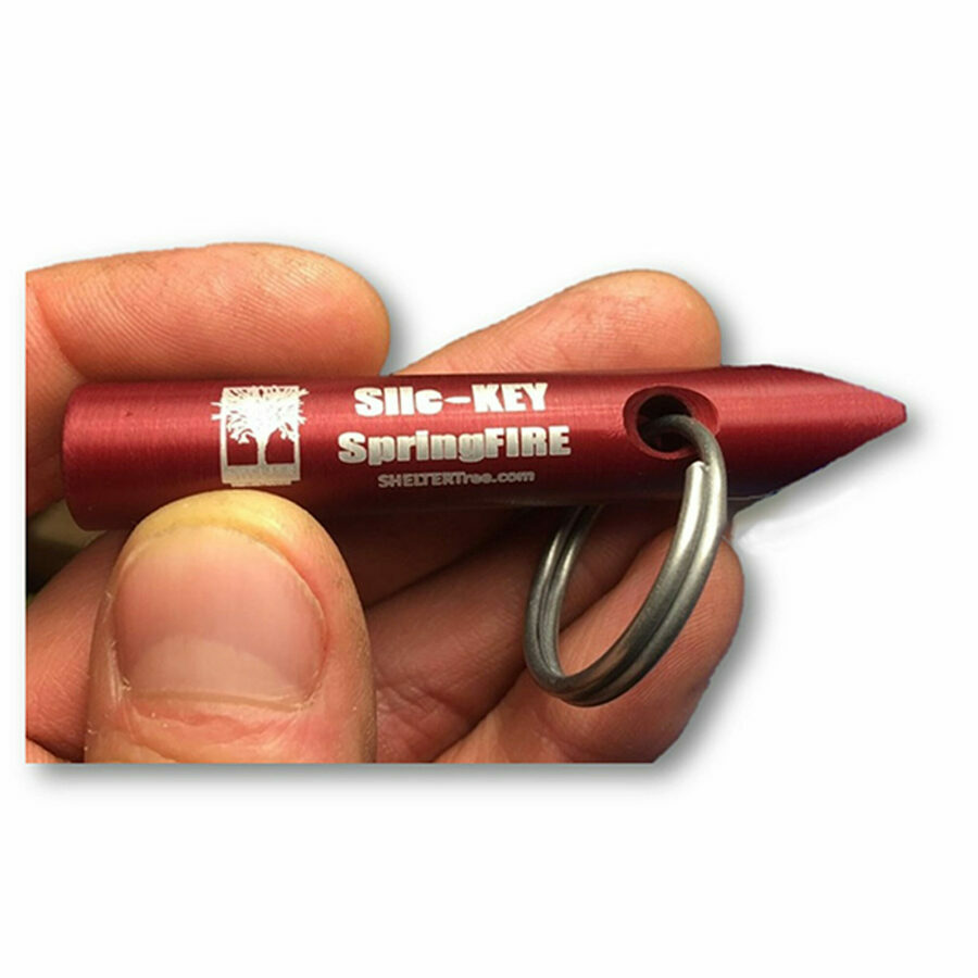 Description: SHELTER's Slic-KEY SpringFIRETM - This item is discontinued, while supplies last. A great small device to help gloved (or non) hands conveniently operate the Slic pins on the Rope Wrench by Singing Tree. Designed by an arborist for arborists.