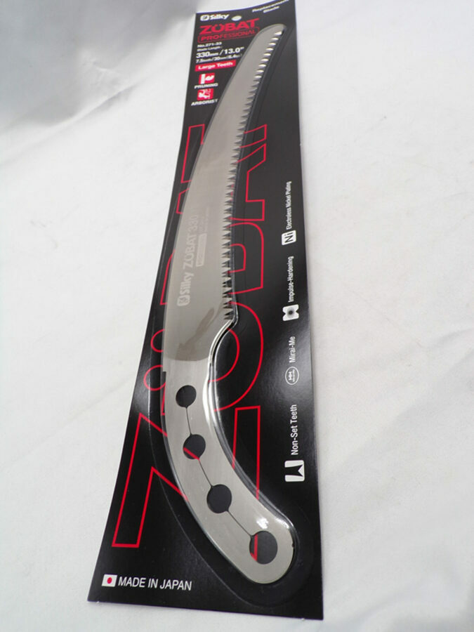 Description: Curved mono-constructed rust-resistant blade. Hard-chrome plated and taper ground with an impulse-hardened nonset tooth design. Cuts through tree limbs like butter Curved blade provides greater cutting speed with less effort. Proprietary Silky MIRAI-ME Technology employs precision-ground, razor sharp teeth with four cutting angles that deliver a fast, clean and extremely smooth cutting action.