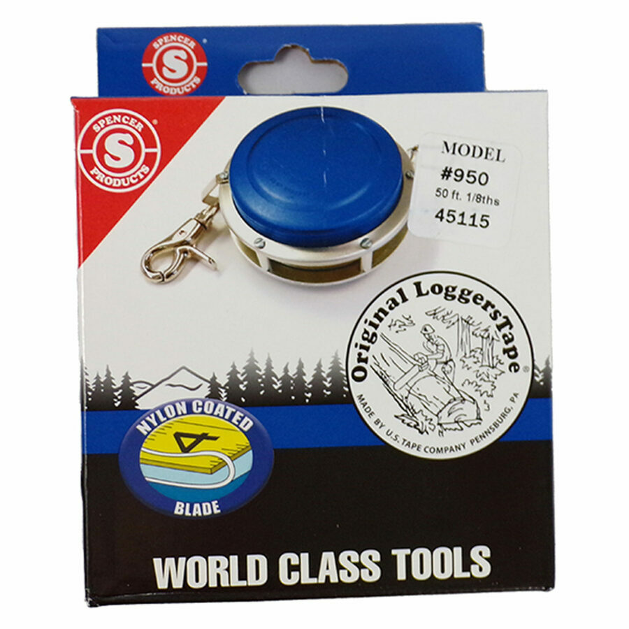 Description: Spencer 3/8″ Wide Logging Tapes are designed to last through the most rugged conditions. The tapes feature an aircraft aluminum case, alloy steel main shaft, and a nylon coated blade for added durability. An open reel design with gear drive and automatic rewind will help reduce the strain of your tasks. The blade is double side printed with English measurements in 8ths.