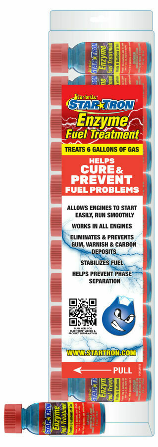 Description: Star Tron Enzyme Fuel Treatment is a multifunctional fuel additive which uses a unique enzyme technology that allows all engines to start easily and run smoothly, even when using ethanol-blended fuel or after sitting idle for months. Star Tron allows fuel to burn more completely, which results in maximum performance, fuel efficiency and reliable operation. Star Tron will stabilize fuel for up to two years, preventing the formation of gums and other solids that clog carburetors and fuel injectors. Star Tron helps prevent phase separation by dispersing water throughout fuel as submicron-sized droplets that can be safely eliminated while the engine operates. Star Tron Small Engine formula is ideal for use in all gas engines including; boats, cars, trucks, motorcycles, small equipment as well as engines that use pre-mix fuel.