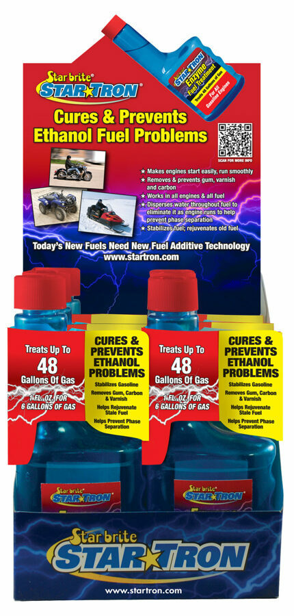 Description: Star Tron Gasoline Formula makes engines start easily and run smoothly. It cures & prevents ethanol fuel problems such as water in fuel, or lost power. It also helps prevent phase separation, removes gums, varnish and carbon deposits and will stabilize gasoline for up to 2 years. It works in boats, cars, motorcycles, small equipment or any other 2 or 4-cycle engine.
