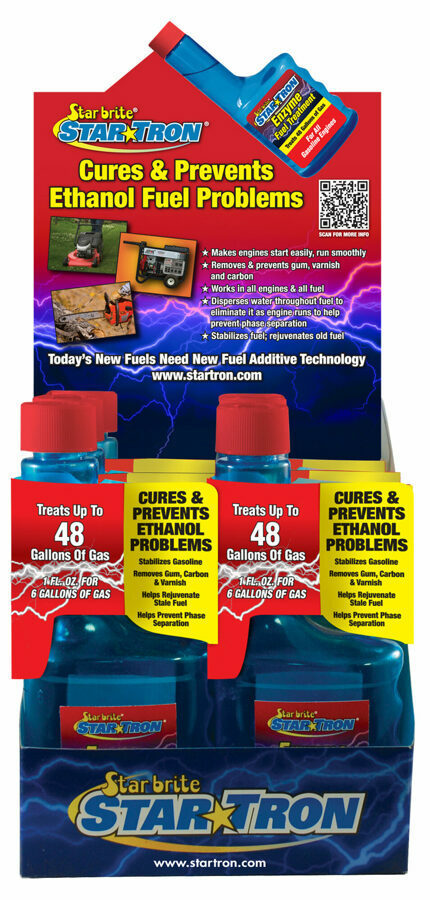 Description: Star Tron Gasoline Formula makes engines start easily and run smoothly. It cures & prevents ethanol fuel problems such as water in fuel, or lost power. It also helps prevent phase separation, removes gums, varnish and carbon deposits and will stabilize gasoline for up to 2 years. It works in boats, cars, motorcycles, small equipment or any other 2 or 4-cycle engine.