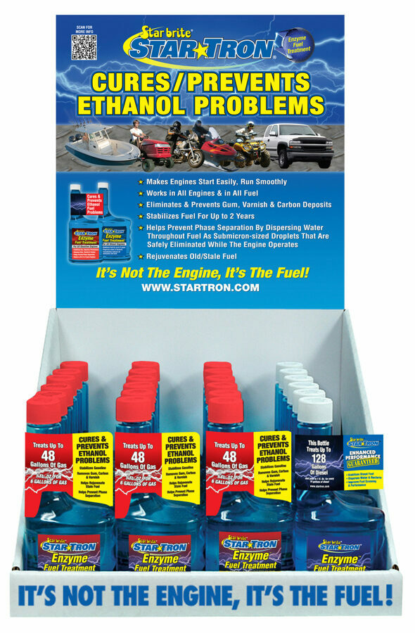 Description: Star Tron Gasoline Formula makes engines start easily and run smoothly. It cures & prevents ethanol fuel problems such as water in fuel, or lost power. It also helps prevent phase separation, removes gums, varnish and carbon deposits and will stabilize gasoline for up to 2 years. It works in boats, cars, motorcycles, small equipment or any other 2 or 4-cycle engine.