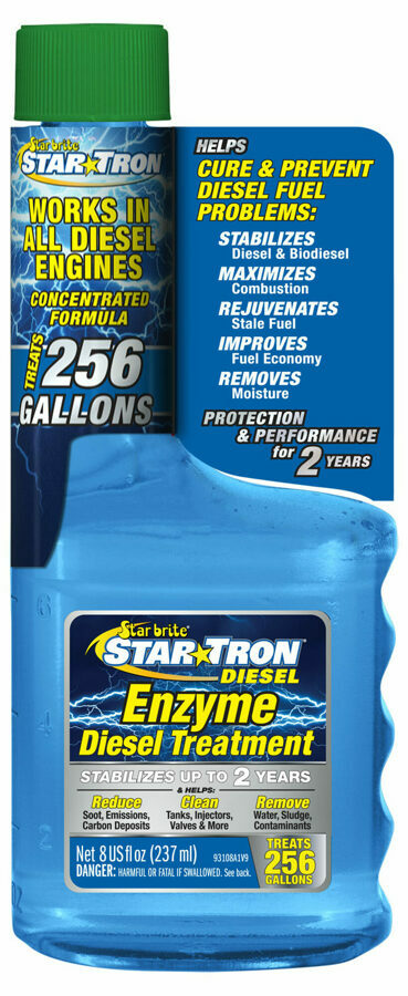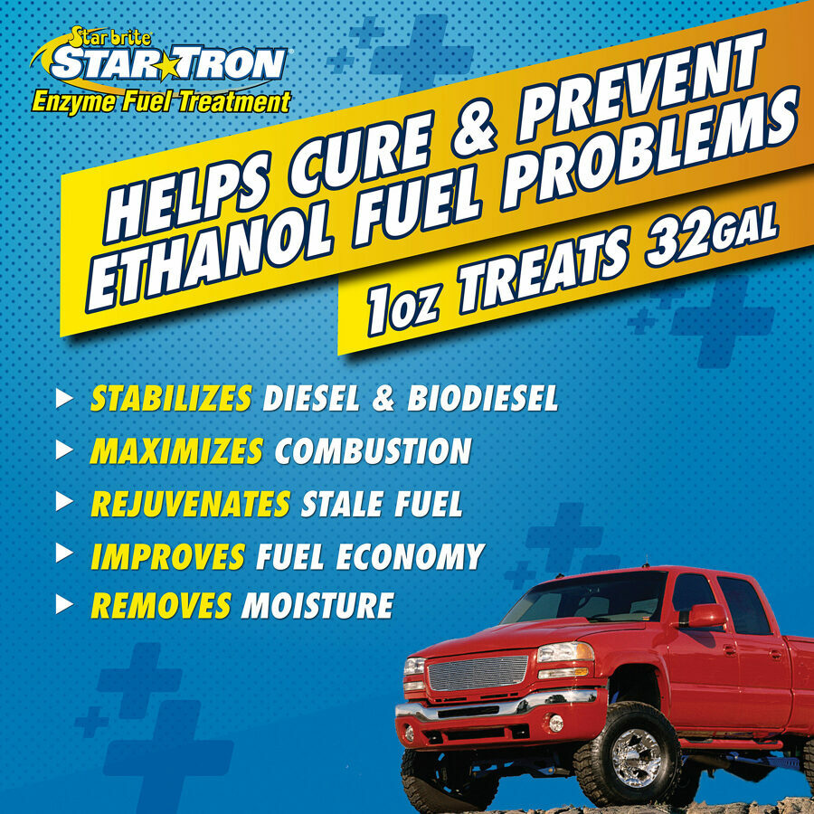 Description: Star Tron Enzyme Fuel Treatment is a multi-functional fuel additive which uses a unique enzyme technology that allows all engines to start easily and run smoothly, even after sitting idle for months. Star Tron® eliminates and prevents fuel problems. Star Tron breaks down excess water and sludge to sub-micron size, allowing it to be safely burned away during normal engine operation. Star Tron was rated “Best Choice” in an independent review of the seven most popular diesel treatments that guard against fuel-tank corrosion. Star Tron® increases fuel economy by cleaning the entire fuel delivery system, removing performance robbing gum, and varnish deposits while modifying how fuel burns. This results in more complete and uniform combustion, maximum performance, increased fuel efficiency, reduced emissions, and reliable operation. Star Tron eliminates carbon build-up from burners, injectors, and exhaust components. Star Tron will stabilize fuel for up to two years, preventing the formation of gums and other solids that clog fuel injectors. Star Tron can help rejuvenate old and sub-spec fuel. Star Tron is safe for all engines and overdosing is not harmful.