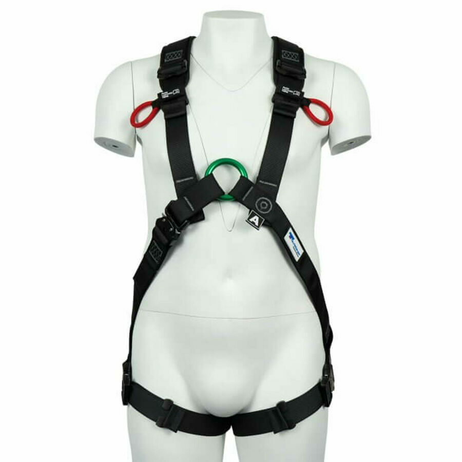Openable and adjustable aluminum buckles with safe closing indicator. 2 red fiber loops to store your lanyard connector (park lanyard attachments). 2 green Attachment points: Foldable Dorsal (Fall arrest) Sternal (Fall arrest). Fall indicators in the webbing under the fall arrest eyelets.