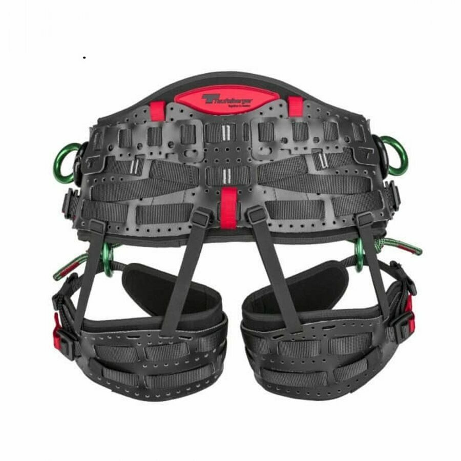 Description: Teufelberger treeMOTION Essential - New Harness and replaces the TreeMOTION S. Light New as of June 2022 the beloved treeMOTION S.Light Harness breathes a major redesign. Instead of a one size fits most, Teufelberger has responded to the demand and now offers three sizing offerings. Affordable. Sliding buckles. Standard back and leg pads. Can accomodate two bridges. So what are the main differences between the Essential vs. the Pro? Sliding adjustable buckles vs. Cobra Quick Connect buckles, Standard padding vs. Comfort padding. Both paddings are interchangeable. 2x2 Gear brackets vs. 2x3 gear brackets plus 2x1 gear brackets downside the harness, No red elastic bands on waist and leg loop, Thinner material and lighter adjustable buckles make this harness extremely light.
