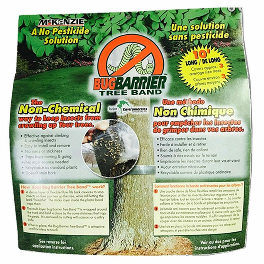 Description: Bug Barrier 10' Kit - Gypsy or Winter MothThe BugBarrier Tree Band is a simple-to-install and non-poisonous approach to effectively trapping and killing a list of insects capable of defoliating full-grown trees. BugBarrier Tree Band works the entire season to catch canker worms, gypsy moths, ants or similar insects on a hidden, sticky surface that stops them from climbing trees. The product arrives in two rolls. The first is dense cotton under layer that fills crevices in the bark to detour passage above. The second roll is a sticky and wide band capable of retaining thousands of tree-killing pests during the season. Although most pest movements happen in the spring and fall, check with your local extension service to find out the correct season. Best of all, when your customer sees how effectively this product works, you can expect a call every season! BugBarrier Tree Band can be installed in 3-5 minutes and removed in about 30 seconds using the step by step instructions listed below. The only tools required are scissors or utility knife and, for deeply furrowed bark, a putty knife.