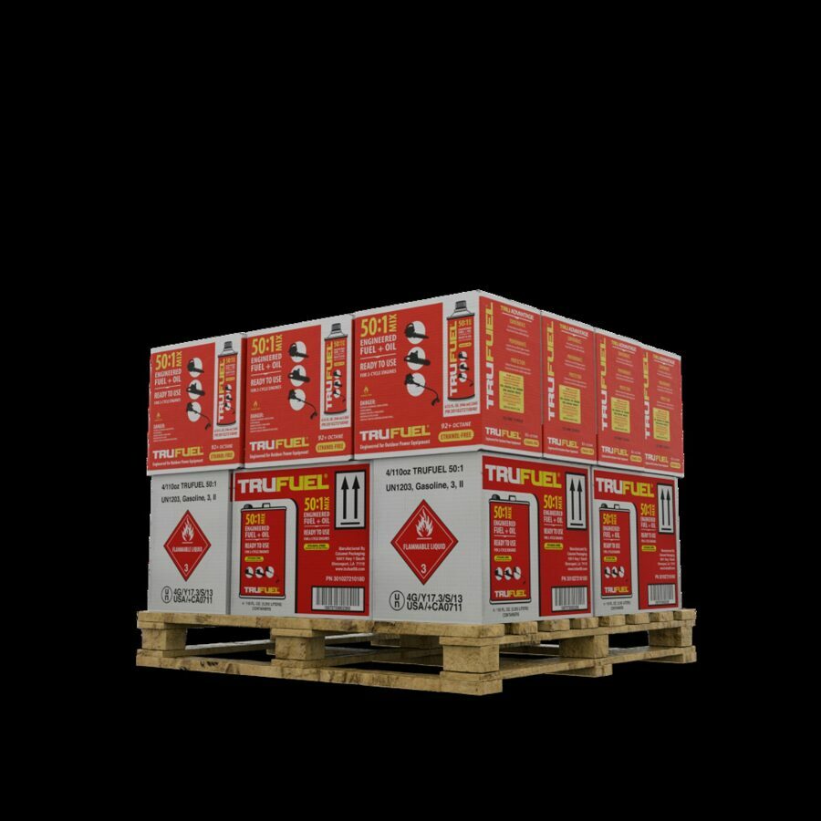 Description: TruFuel 50:1 Mix, designed to work with outdoor power equipment that requires a 50:1 gas to oil ratio. Mini pallet of 72 cans of 32 oz. and 28 cans of 110 oz.