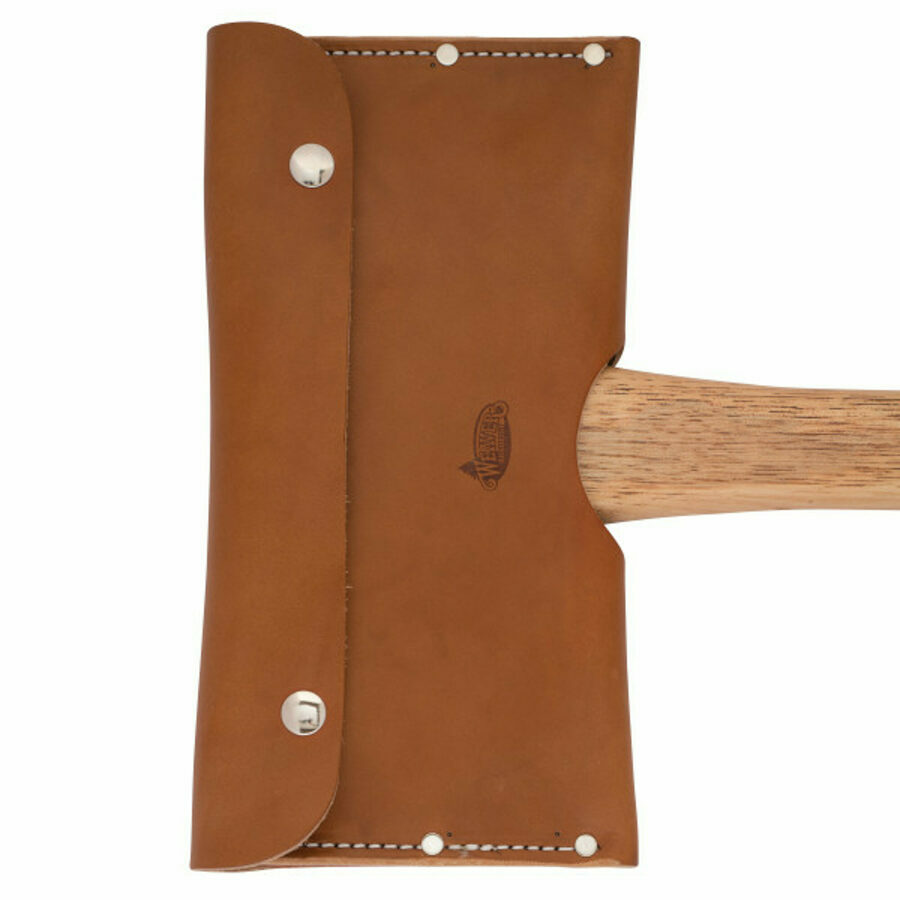 Weather-resistant top grain steer hide harness leather guard slips over a double bit axe and easily snaps closed.