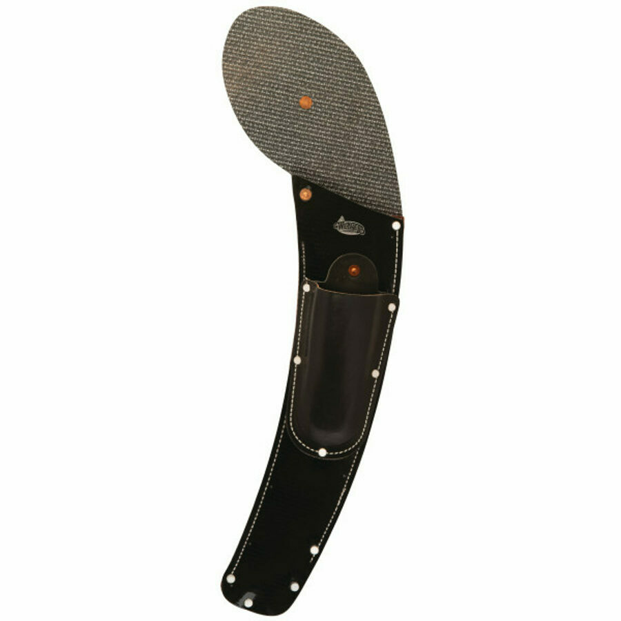 Pruner pouch fits pruners 8" and smaller and is made from black top grain steer hide leather on the rubberized belting style.