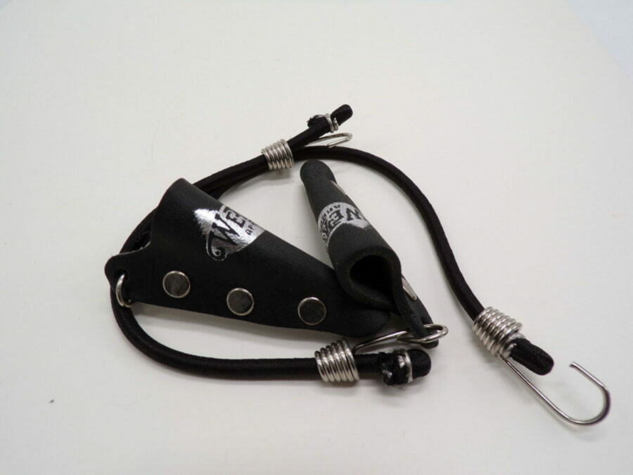 Description: Heavy-duty black leather is riveted together to form these gaff guards with bungees for easy attachment