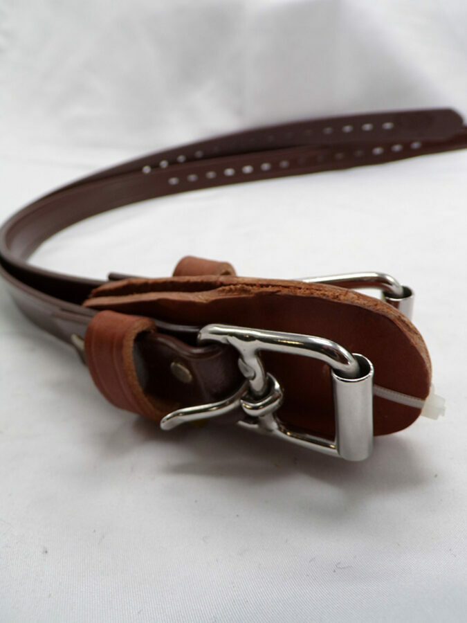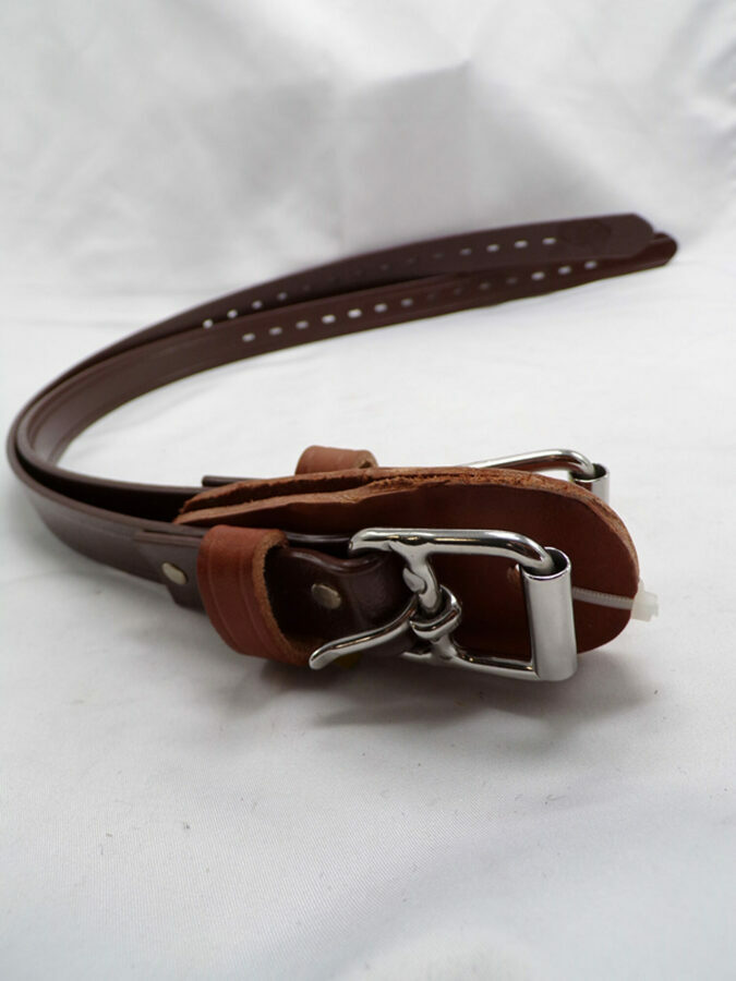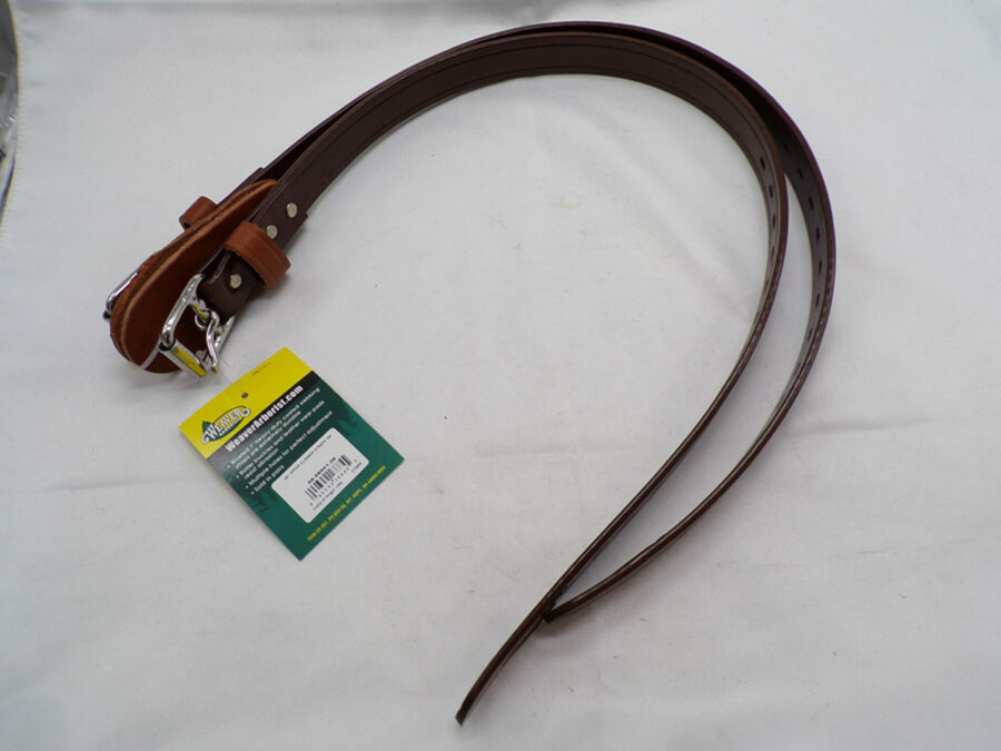 Roller buckles and top grain yellow latigo steer hide leather wear pads resist abrasion.