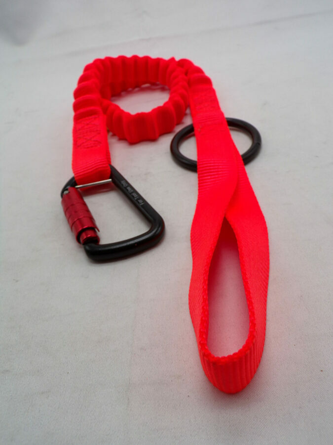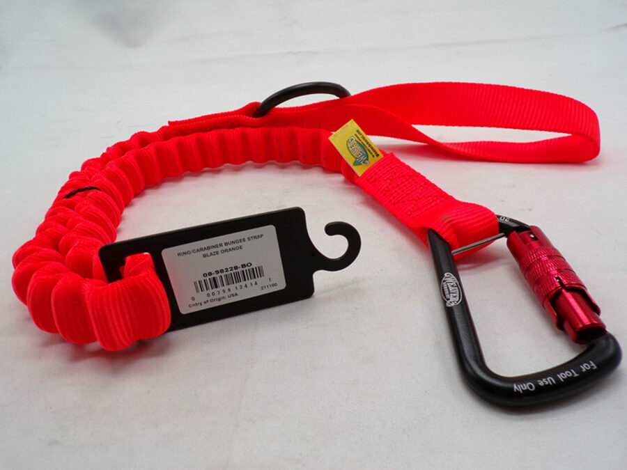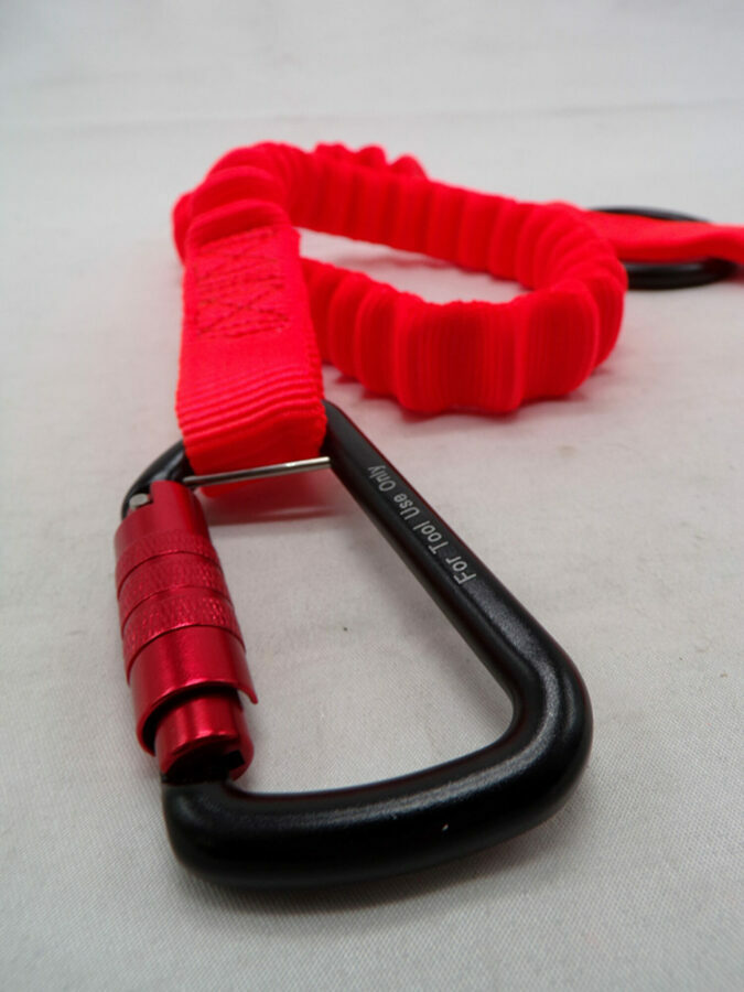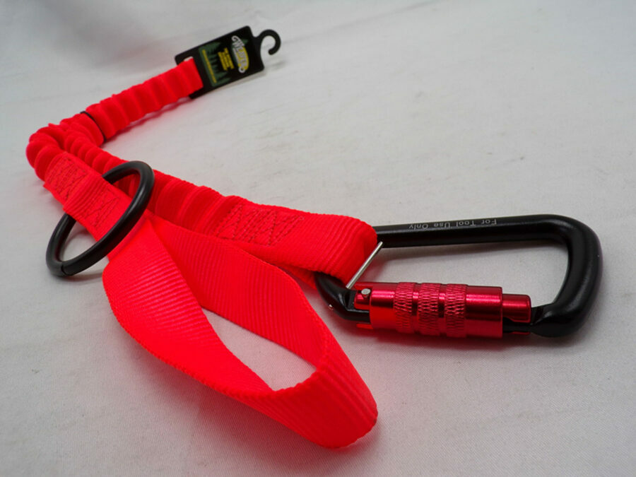 Equipped with a single locking, double action, cold formed aluminum carabiner at one end. For tool use only. Not for life support applications.