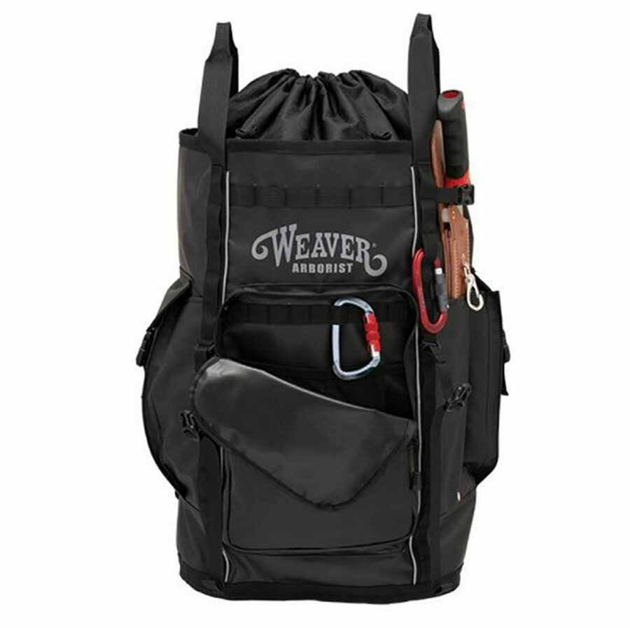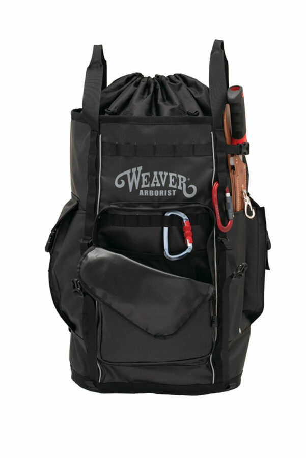 Outside pockets include a specialized handsaw pocket, two pockets with buckle closures, and a zippered front pocket with internal divider and daisy chain