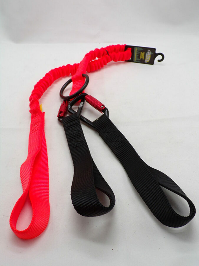 Description: Bungee design features two interchangeable webbing straps that allow climbers to easily switch out chainsaws while leaving the bungee secured to their saddle