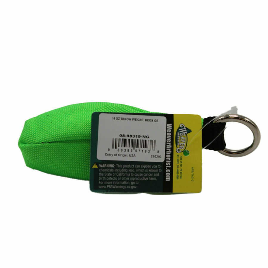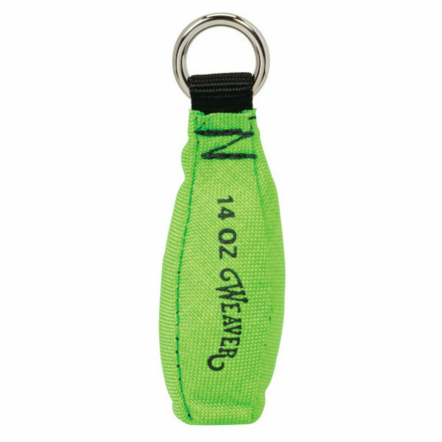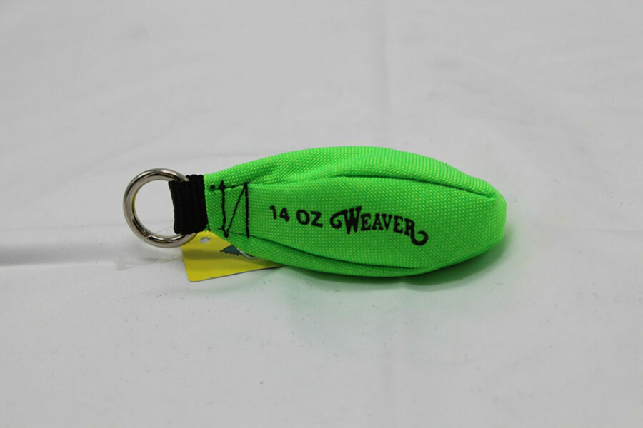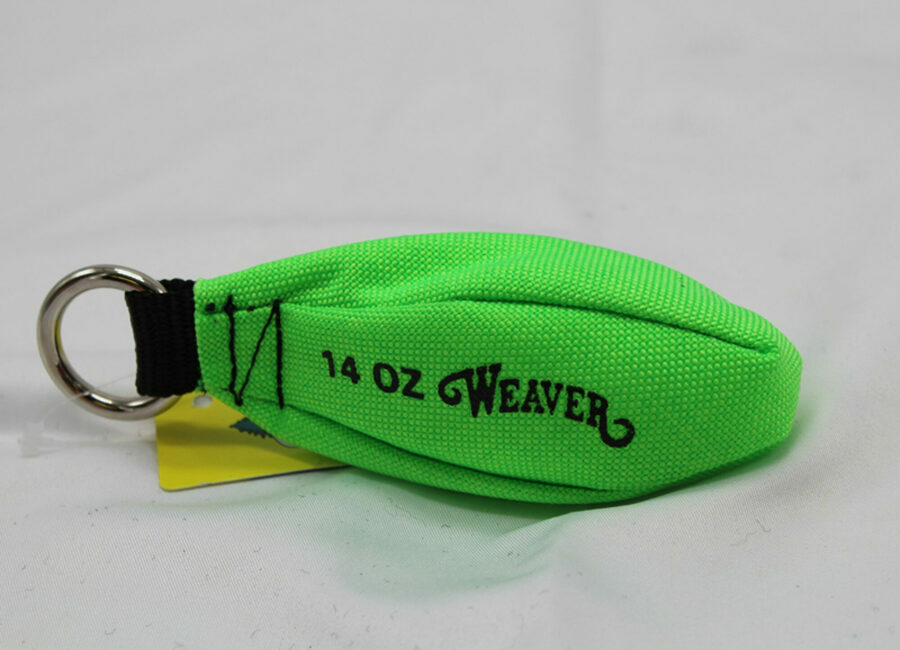 Description: Weaver's aerodynamic cordura throw weight is designed to help increase the range of the throw. The moving action of the no. 8 shot that fills these Cordura weights helps prevent the weights from hanging up in tree branches. The coated lead shot is contained in a latex pouch for environmental protection. A 7/8 inch nickel plated ring for attachment of a rope or poly pilot line is box-stitched to each weight.