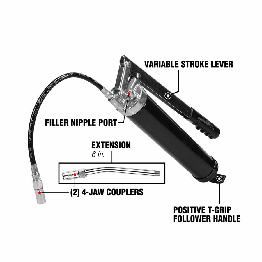 Features: Heavy-duty Die-cast Head Construction - For maximum durability and longer active service life Durable Follower Rod and Spring - For consistent priming Variable stroke allows grease delivery in confined areas where short strokes and high pressure on demand are needed Bleeder valve for purging unwanted air Ergonomic lever grip 3-Way loading - Cartridge, bulk, filler nipple Holds 14 oz. Grease Cartridge Includes: Two 4-Jaw couplers for better grip and longer service life, 12 in. flexible grease hose and 6 in. angled extension Strokes per ounce = 24