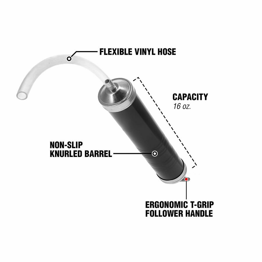 Features: Heavy-duty follower for positive suction Ergonomic T-grip follower handle Flexible vinyl hose for hard to reach areas Non-slip knurled barrel for better grip 16 oz. capacity